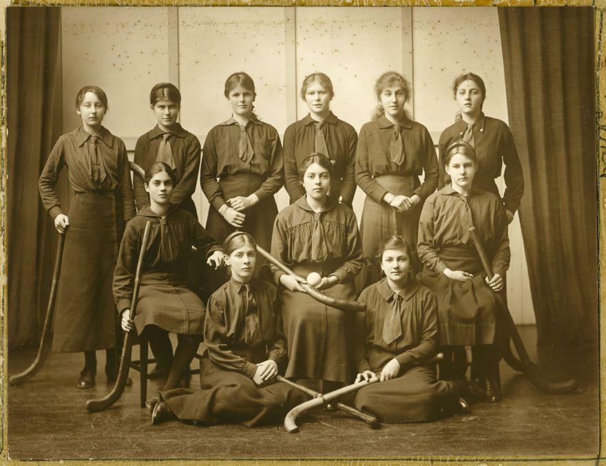 Members of the Craven School Hockey Team. From left, back: Betty Abraham (Mrs Rupert Ashworth), Esther Armstrong (Mrs E A F Wilding), Sybil Baldwin (Mrs C Fullerton-Smith), Nora Temple, Glory Simson (Mrs B De Castro), Kitty Joske (Mrs Albert Dunlop). Front: Sydney Brandon (Mrs De Clare), Nita McHardy, Avril Strachan (Mrs E C Brevis). Front, ground: Dorothy Aldrich, Phyllis Goodson.