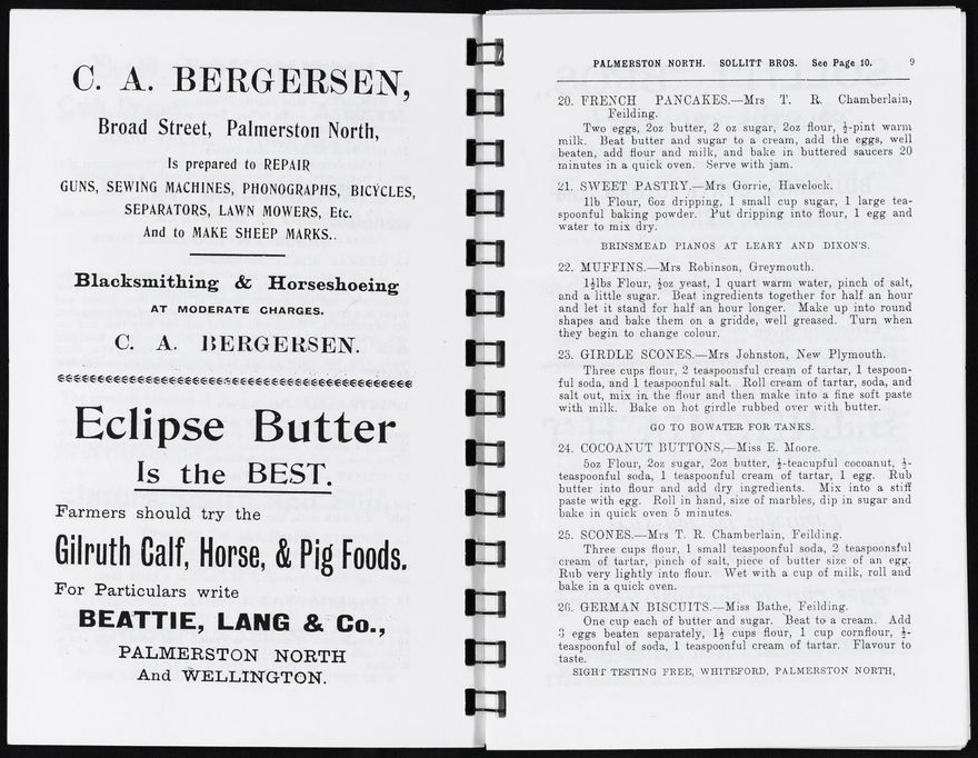 A reproduction of Our Own Cookery Book compiled by Mrs J. West for the Ashhurst Town Band Bazaar. The cook book features community submitted recipes (including the names of contributors) and includes many advertisements of local area businesses.