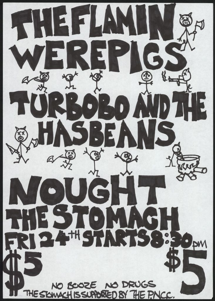 - The Flamin' Werepigs, Turbobo and the Hasbeans, Nought. The Stomach. Fri 24th starts 8.30pm. $5. No booze. No drugs. The Stomach is supported by PNCC.