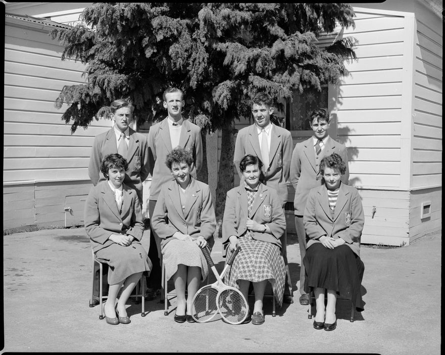 A group of eight students at the Palmerston North Teachers' College pose with tennis rackets. This negative comes from the Elmar Collection - a large series of semi-identified and unidentified images from the 1930s-1970s.