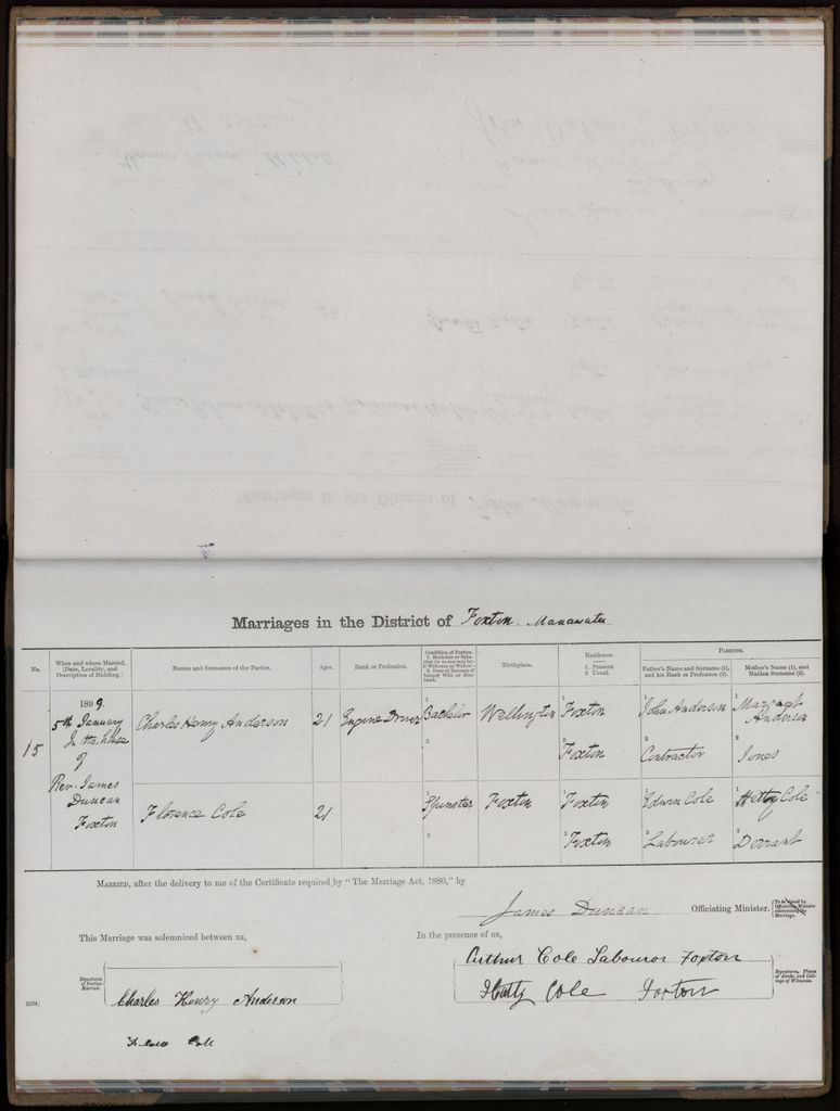 This marriage register was for the Foxton Presbyterian Church from 20 September 1894 to January 1905. The reverend was Reverend James Duncan. It includes registry of marriages outside Foxton and Certificates of Dissolution of Marriages where applicable.