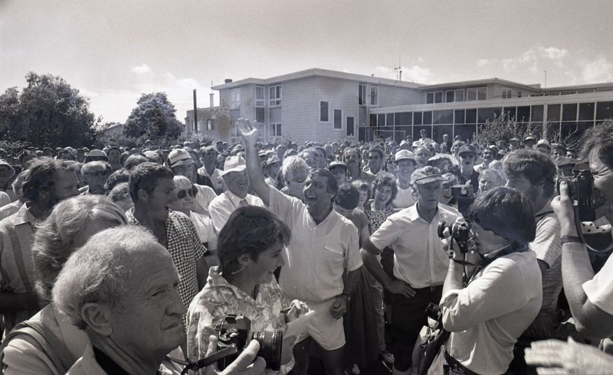 This series of images was taken for a story that ran in on the front page of The Manawatu Evening Standard on 10 February, 1987. The story pertains to the mortgagee auction of a farm owned by Paul Geurtjens of Bulls. Up to 700 protesters attended the auction at Harcourts real estate on Fitzherbert Avenue. Auction proceedings were interrupted by protesters placing false bids and drowning out proceedings. The property was not sold as it didn’t raise a bid. The images of Longburn workers protesting appear on the same roll of film, however it is unclear if theese are from the same event.