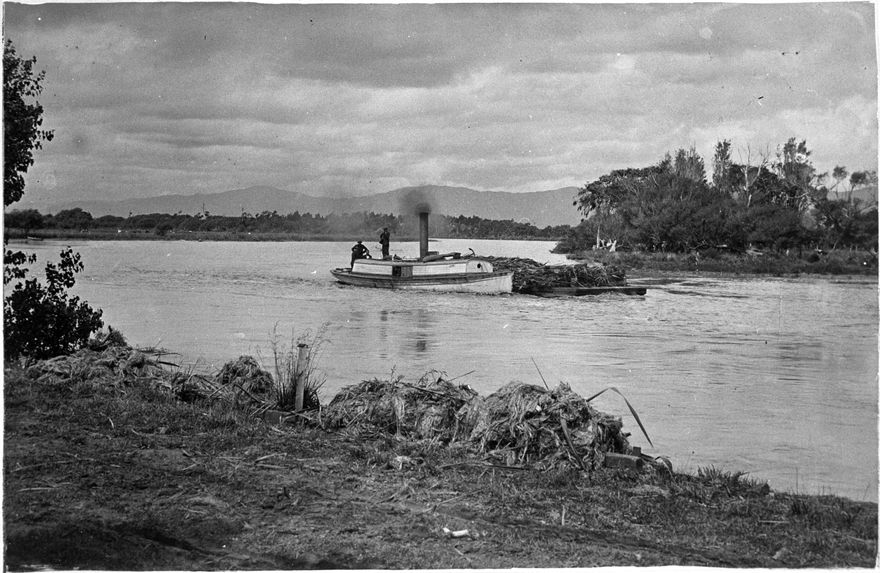 A steam launch is towing a punt load of flax from the Moutoa Swamp to a flaxmill in the borough of Foxton.