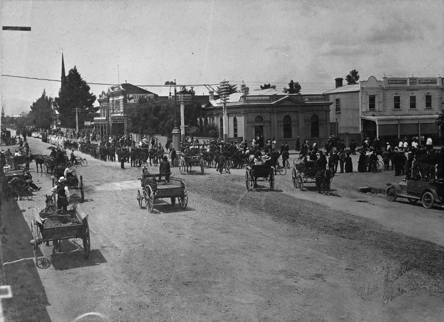 Reverend Father P.C. Costello died in Palmerston North 7 December 1912. The funeral was very large with 50 priests from all over the district attending. The procession is shown at the corner of Broad Street (now Broadway) and The Square.