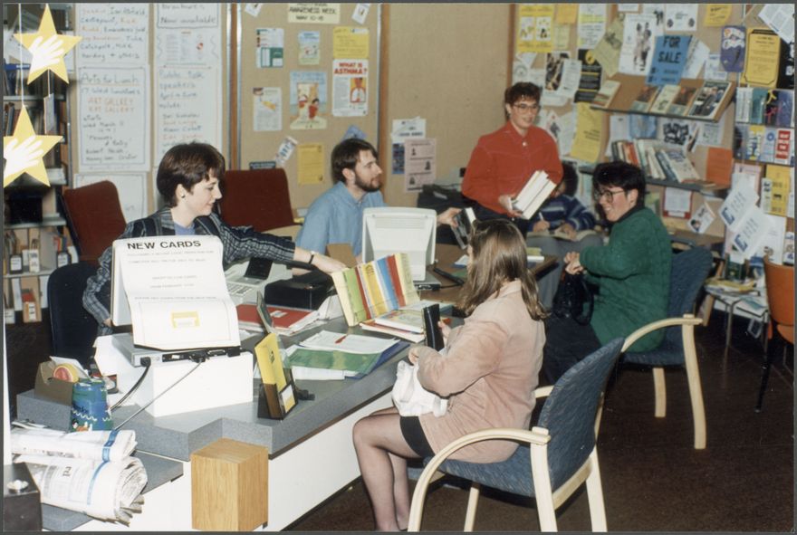 Staff of the Palmerston North Public Library, with customers. The Public Library was on the corner of The Square and Main Street. Taken on the occasion of the millionth issue of a library item.