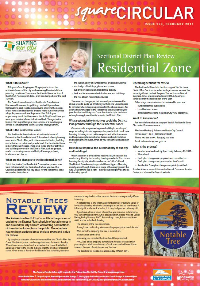 The Square Circular was Palmerston North City Council's monthly community publication, informing Palmerstonians of PNCC initiatives, activites, and events. This month's issue includes: District Plan; Notable Trees; Boundary; Relief Work; Pool Safety; Recycling; Te Manawa; Community House; Events; Civil defence; Rates; Volunteer work; Sustainability.