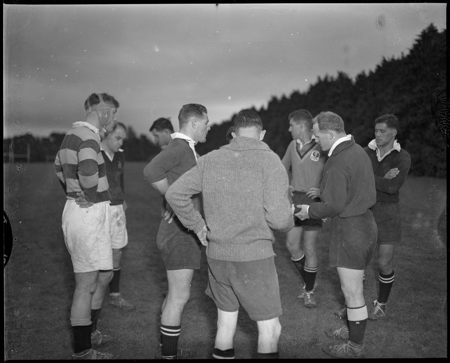 This image was taken for a story that ran in The Manawatu Evening Standard on 28 July 1958, page 6: "W.J. Whineray (second from right), the captain of Probables A in tomorrow's North Island All Black Rugby trials, explains a point to his forwards before a practice on Ongley Place this morning. With his back to the camera is Mr. L. Morgan (Manawatu), the coach."