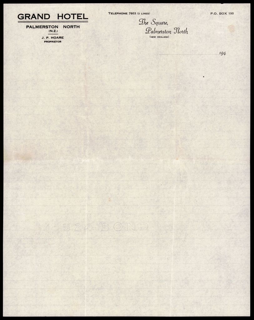 Mrs. Mary Elizabeth Everitt, and Mr. Noel Sheffield Everitt, originally of Masterton, visited Palmerston North for their honeymoon in 1942. The items in this collection are the result of their stay at the Grand Hotel (The Square).