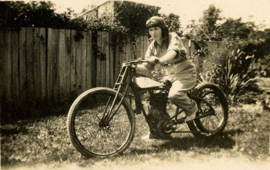 Josie Griffiths on a circa 1924-26 Blackburne engined Chater Lea motorcycle. Photo taken in the back garden at 19 Ngata Street, Palmerston North, circa 1929. This motorcycle was ridden by Fiery Faulkner who earned his nickname when he rode this bike over the finish line in first place at a race while it was heavily on fire. The bike was destroyed when the fire was unable to be put out afterwards.