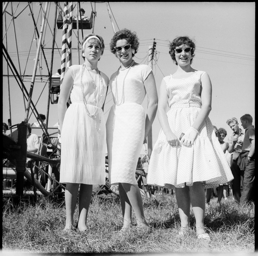 This image was taken for a story that ran in The Manawatu Evening Standard on 09 November 1960 "Women made the best of the brilliant sunshine to parade their summer finery at the Show on Saturday. Those who arrived early preferred to play safe and chose suits and coats, but the afternoon patrons, predominantly teenagers, heralded in summer. Gay cottons, silks or ginghams in the popular florals, strips and spots, styled on either the sheath or full-skirted lines, were colourful highlights. Many chose the sleeveless and low-backs and it was suspected that sun lotions would be well in demand. Above are three young women in relaxed mood, enjoying the sunshine. They are (from the left): Misses Moira Toomey, Dianne King and Margaret Bailey."