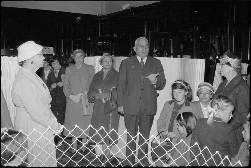 Caption: “Part of the large crowd of interested spectators who cast an approving eye over the dolls on display at Milne and Choyce over the school holidays. This was the largest display of dolls to be assembled in New Zealand.”