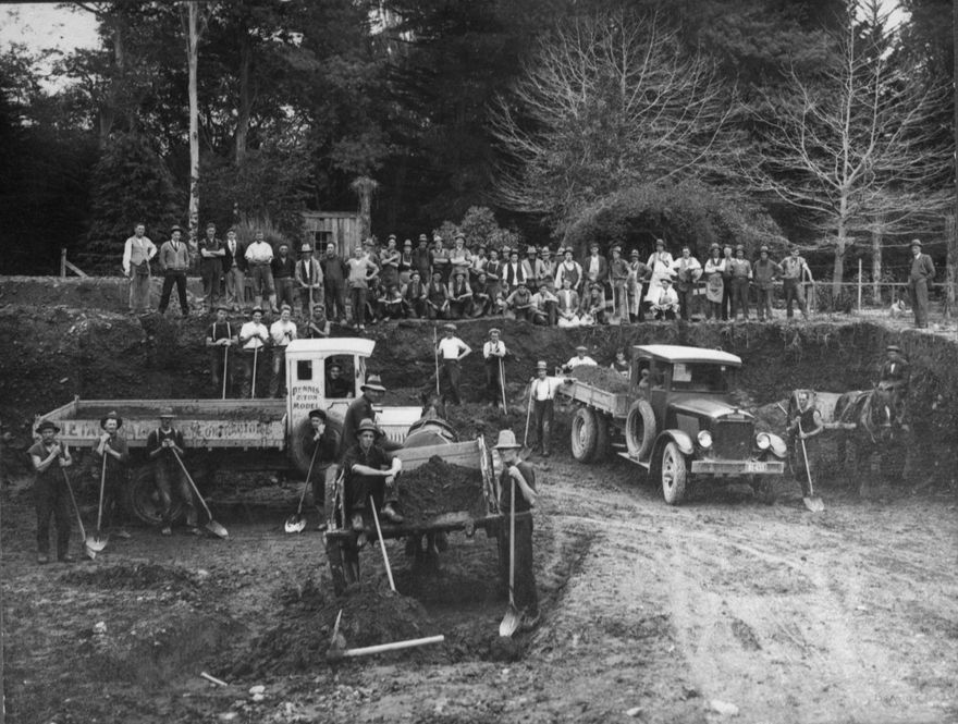 The Main Science Building of Massey Agricultural College was designed by Lippencott and built by the Fletcher Construction Company in time for the beginning of the 1931 academic year. Excavations were dug out by hand and carted away in drays and trucks. Two of the contractors, identified on the trucks, were the NZ Express Co., which owned the Dennis, 1/2 ton model truck, and W ("Brum") Smith, Sand and Gravel Contractor, which also owned the 2 drays in the photograph. The Main Science Building remains in use at Massey University today, as the 'Old Main Building'. Idenitifed men: Jack Stevens (5th from left, standing on the terrce); Arthur Cooksley (7th from left, standing on the terrace); Tom Dougherty of Steelbenders, Palmerston North (16th from left, standing on the terrace); 'The Boss' of Fletcher Construction (standing extreme right, on the terrace); Dan Sullivan (standing with shovel on the left)