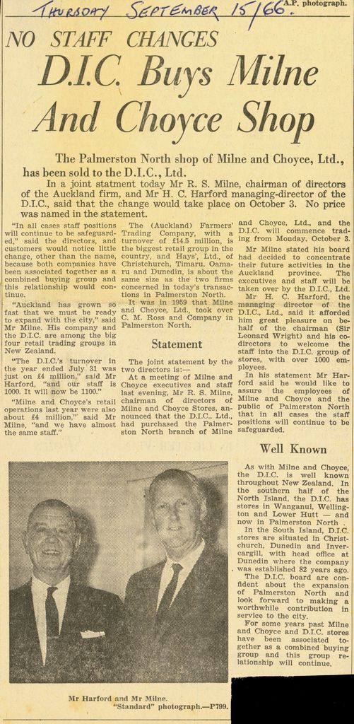 - Milne and Choyce bought out C M Ross Co Ltd in 1959, and continued running the business as a department store until they sold the business to the DIC in 1966. The building is now the Palmerston North City Library.