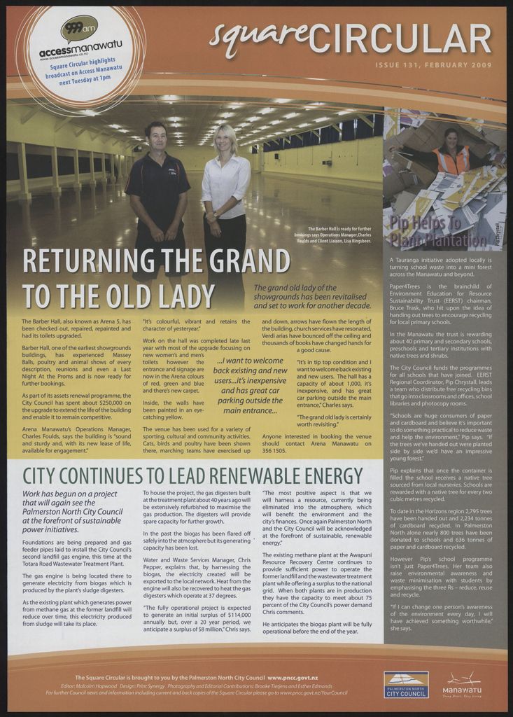 The Square Circular was Palmerston North City Council's monthly community publication, informing Palmerstonians of PNCC initiatives, activities, and events. This month's issue includes: Barber Hall, Totara Road wastewater treatment plant, environmental education, District Plan Review, customer services centre hours, library book launch, library poetry nights, disability access, Destination Manawatu, Festival of cultures, Children's day in The Square, Summer in the park concerts.
