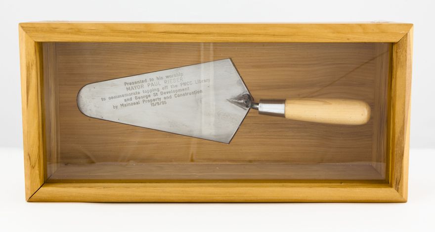 A 330mm long engraved stainless steel trowel with a wooden handle. The trowel was used for the topping off ceremony to mark the completion of the major building structures in the construction of the present Palmerston North City Library Building on The Square in the former Rosco department store premises. The trowel comes with a glass fronted wooden display box. The engraving on the trowel reads 'Presented to his worship MAYOR PAUL RIEGER to commemorate topping off of the PNCC Library and George St Development by Mainzeal Property and Construction 15/9/95'.