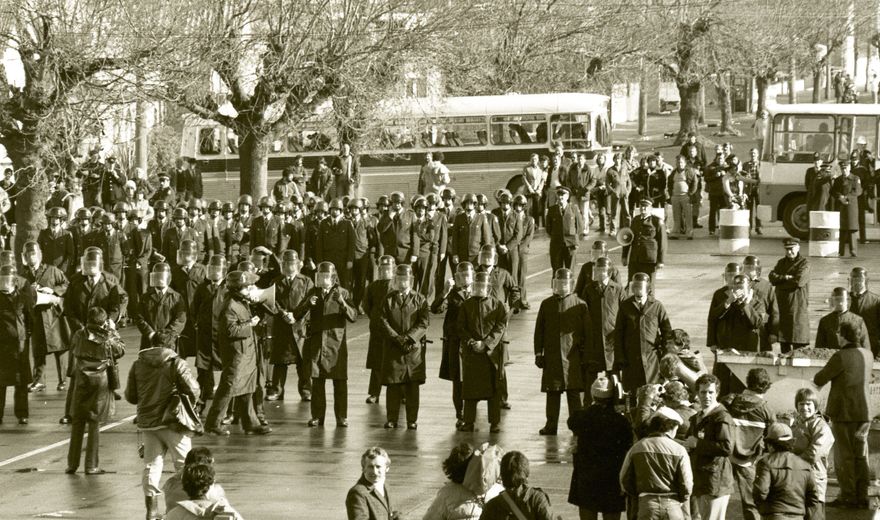 This image was taken (but not used) for a story that ran in The Manawatu Evening Standard on 01 August 1981. Extra police personnel were flown into Palmerston North in anticipation of game-day anti-Springbok Tour and anti-Apartheid protests. The Standard reported there were 1000 police, including a special riot squad, and 5000 protestors. The 1pm March culminated in a 24 minute standoff with the police lines on the corner of David and Cuba Streets.