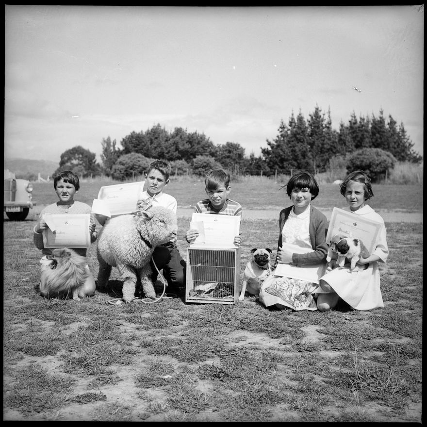 This image was taken for a story that ran in The Manawatu Evening Standard on 18 January, 1964. "Pets of all descriptions paraded at the Palmerston North Carnival of the Lake yesterday. Here, some of the winners are seen with their pets. From the left are: Gail Fairclough, Ian Healy, Timothy Lawrence, Anne Thorner, and Marilyn Climo." See also: 2017N_2017-20_018323, 2017N_2017-20_018321, 2017N_2017-20_018324, 2017N_2017-20_018325, 2017N_2017-20_018326, 2017N_2017-20_018327, 2017N_2017-20_018328.