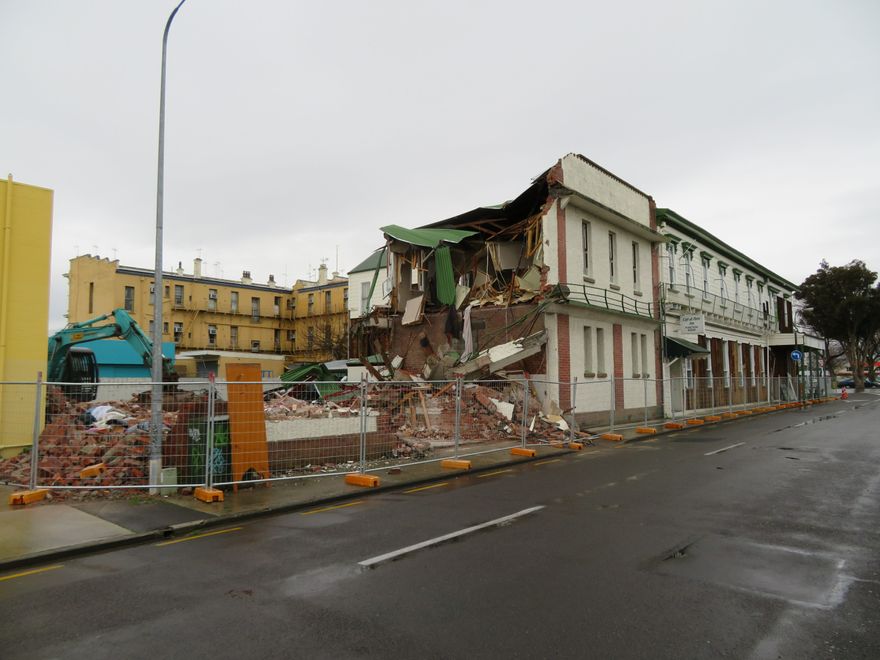 Cafe De Paris Inn during the demolition of the building. This photograph was taken as the exterior facade was being removed. The interior had already been removed. The New Railway Hotel is visible in the background. Taken along Domain Street looking east.