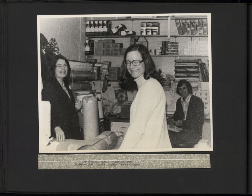 A photograph album from Alexander Clark LTD, a Palmerston North-based home and commercial decoration business. Images include shop displays, staff at work and at social events, and work projects.