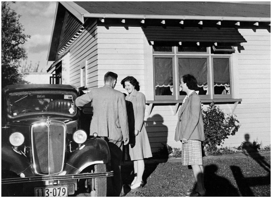 A photographic series prepared by the Prime Minister’s Department in 1947 to attract British migrants. The Evans family of 5 Mansford Place, Palmerston North were selected to show the living conditions of a typical New Zealand family. Betty and Jack Evans are shown at the front of the house of Mr. W D Cooksley, Burns Avenue, offering to take a friend, Beryl Watson, to the pictures (movies). The photograph shows the standard of house that could be a bought with a State Advances (government) loan available to those who could afford the mortgage. The car was provided for publicity purposes and the family would usually walk or take the bus to the centre of the city for entertainment.