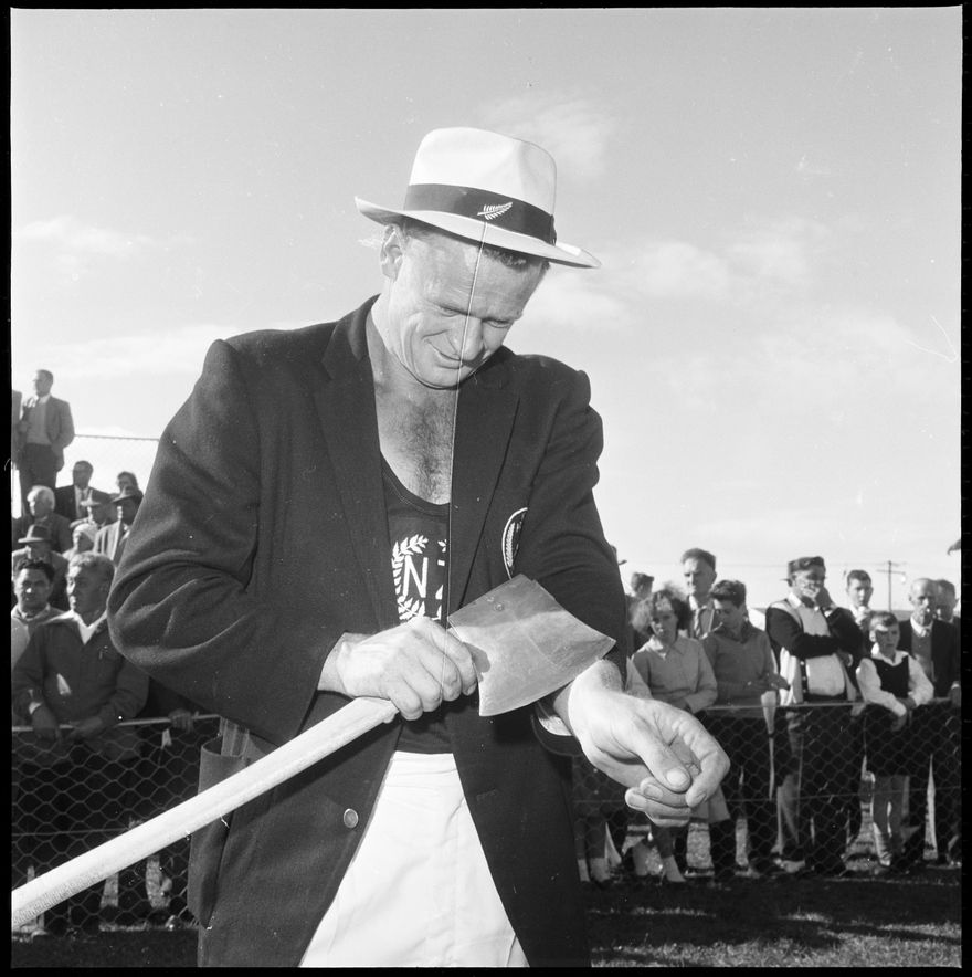 This image was taken for a story that ran in The Manawatu Evening Standard on 13 May 1961 "An axe may be a bit heavy for regular shaving, but the razor-sharp edge of this axe is demonstrated by Mr. H. Honey, who cuts the hairs from his arm during the axemen's carnival at the Industries Fair today. Mr. Honey was one of the seven-man New Zealand team which visited Australia for the Sydney Show."