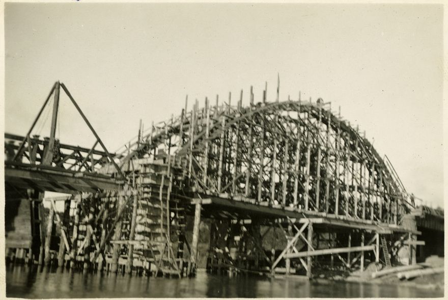 The Fitzherbert Bridge, spanning the Manawatu River, Palmerston North, was built 1933 – 1935. A pile-driver is being used.