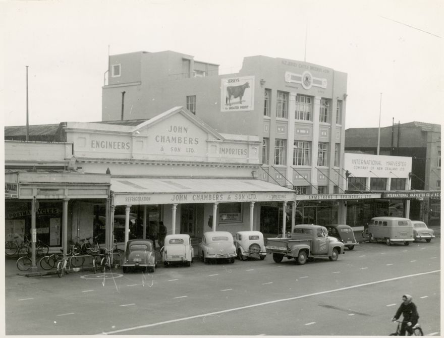 Visible are Hodder and Tolley (mostly obscured), John Chambers and Son Ltd Engineers and NZ Jersey Cattle Breeders Assn building, Armstrong and Springhall Ltd, the International Harvester Company of New Zealand