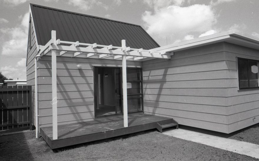 This image was taken for a story that ran in the Manawatu Evening Standard on December 24 1979 with the caption, "Tenants are now moving into seven newly completed Housing Corporation cluster houses near the Church Street-West Street corner. The Evening Standard Lifestyle section featured on of the first of the new cluster-style of state housing about two months ago. This received much favourable comment from readers and the Housing Corporation says tenants, too, are happy with this type of housing. The development (designed by architect Elwyn Evans) is typical of the new approach towards medium-density housing being taken by the Corporation in Palmerston North and throughout the Country. Each house forms a separate unit linked only to other houses by carports."