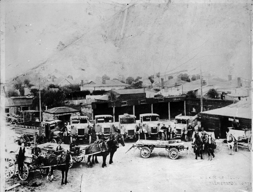 This photograph was taken in the McGiffert Street depot of Child Brothers. Child Brothers Ltd, Carriers and Fuel Merchants, was established in 1919 by Edward G Child and his sons, W J Child & E W H Child. They opened the metal crushing depot and plant at the end of Albert Street near the Manawatu River c.1927. The business later became known as Child Metal Ltd.