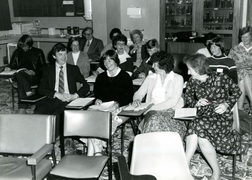Seated in the front row, left from right: Gordon Scrimgeour, Medical Microbiologist, Palmerston North Hospital; Unknown; Marie Fergus, Infection Control Nurse, Dunedin; Berry Bird, Infection Control Nurse, Palmerston North Hospital.