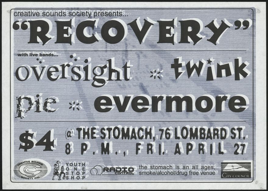 Creative Sounds Society presents..."Recovery". With live bands Oversight, Twink. Pie, Evermore. $4 @ the Stomach, 76 Lombard St. 8pm Fri April 27. Creative Sounds Society Inc. Youth One Stop Shop, Radio Control. The Stomach is an all ages alcohol/drug/smokefree venue. Palmerston North City Council.