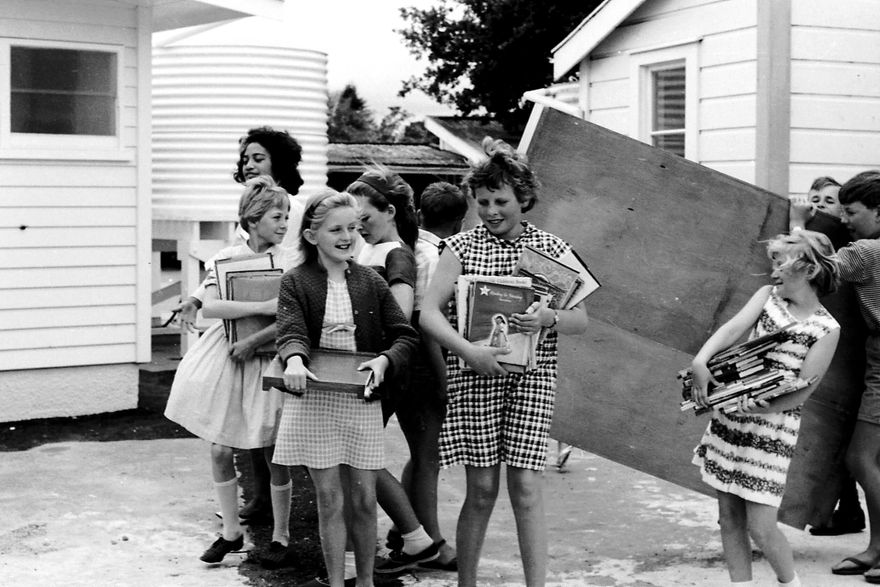 Children moving furniture and items from the old Newbury school to new school buidlings in 1967.