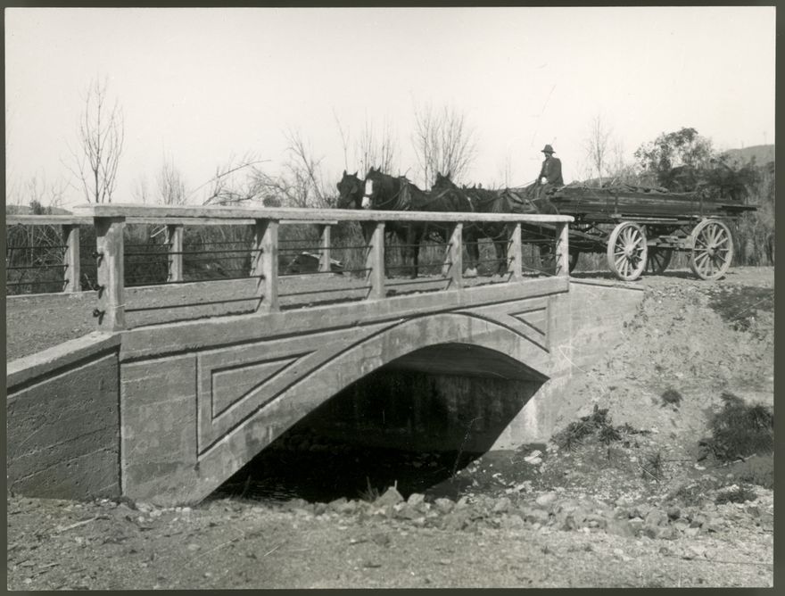 Carting timber, possibly from Foot's Piripiri Mill or Umutoi Mill. The carriage is crossing the Roneura Stream near Komako on the Pohangina Valley East Road.