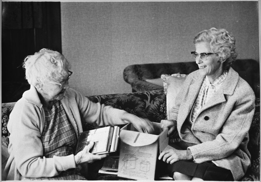 The Palmerston North Public Library commenced a service for housebound people in February 1972, and by 1976 it was servicing 36 people and growing. A volunteer delivered books on a fortnightly basis to people unable to visit the Library themselves and did not have a relative able to help. The service is still provided by the Palmerston North City Library to housebound patrons. Right: Miss Blakeley delivering books.