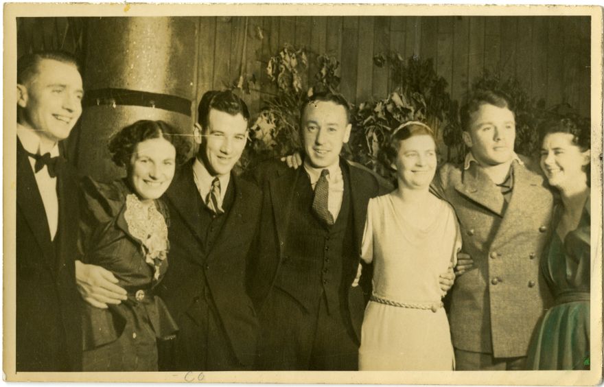 Goldingham and Beckett were Seed,Produce and General Merchants in Palmerston North. Joan Klee is shown in the far-right of the picture in a green dress. The photograph has been hand-tinted by her to illustrate the colour. W.E. Moore is pictured third from left.