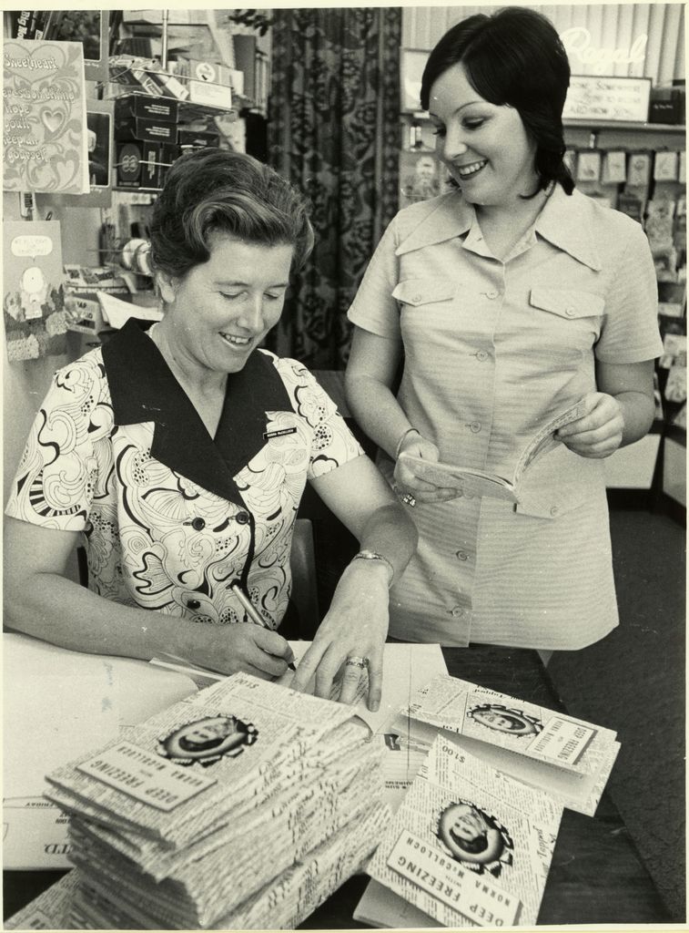 Norma McCulloch, nee Proudlove, was an inventor and author This photograph shows her autographing her book 'Deep Freezing'. Mrs McCulloch was born in Britain and came to New Zealand c. 1960. She made radio and television appearances in New Zealand and Australia on "deep freeze cookery". She also invented the Breath of Life resuscitator, a manual resuscitator for use in CPR. Article in Manawatu Standard 7 February 1974.