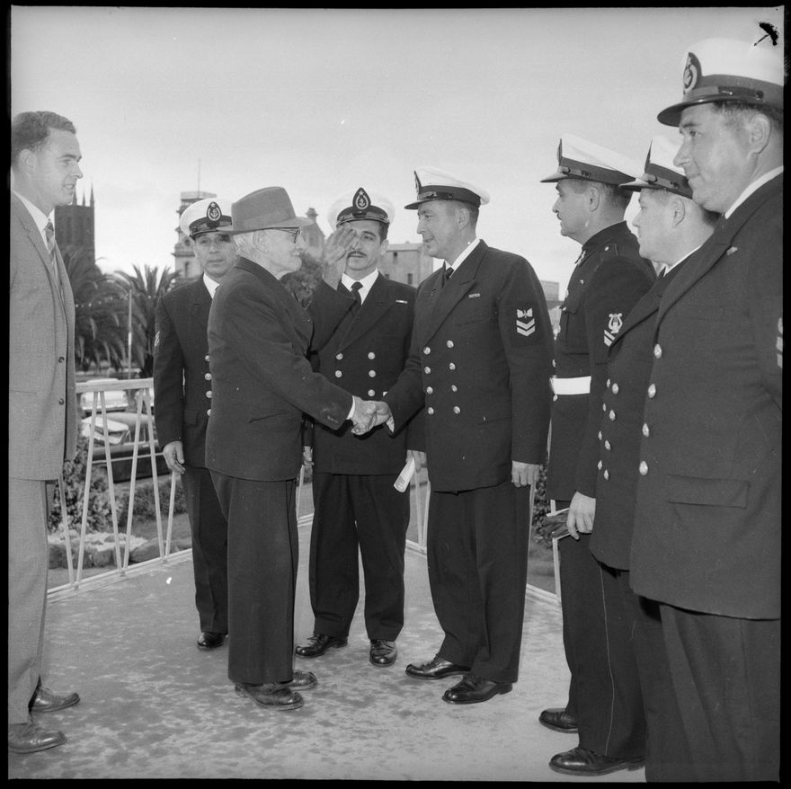 This image was taken for a story that ran in The Manawatu Evening Standard on 14 June 1961 "Believed to be the oldest mariner resident in New Zealand who has sailed around Cape Horn is Mr. D. Bertie, of Feilding. Today he renewed his acquaintance with sailing ships when he met some of the crew of the Chilean barquentine Esmeralda who visited Palmerston North. He is shown meeting some of the senior members of the crew on tour. Mr. Bertie has made over 20 trips around the Horn and obtained his master's ticket in 1901."