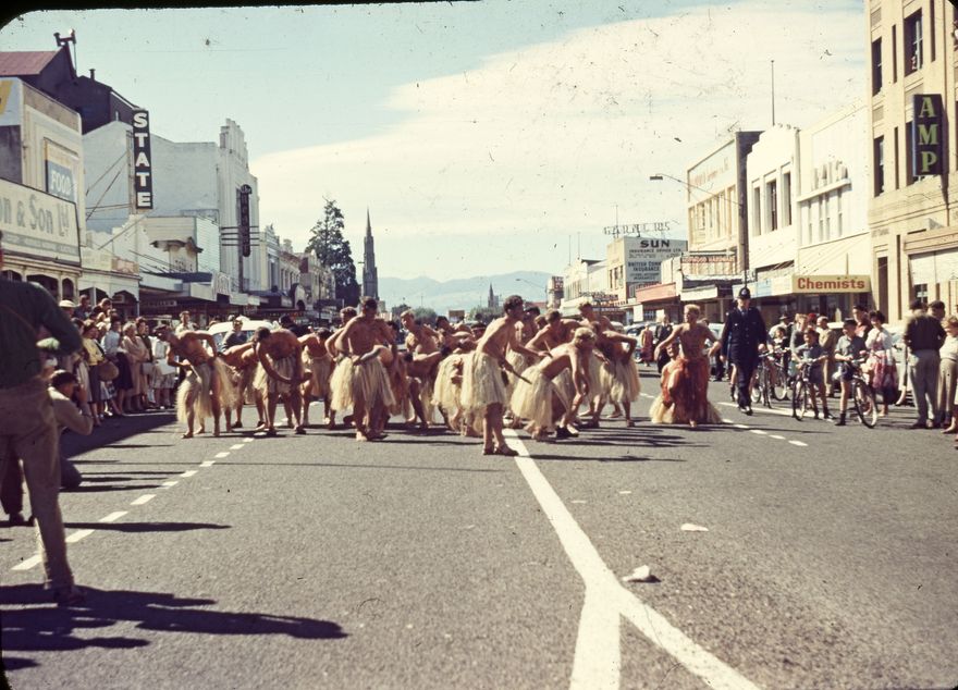 This image depicts a student mock haka party. Mockery of kapa haka was once considered 'just a bit of fun' and was part of the procession every year. The practice slowly died out across Aotearoa in the face of protest and education about manifestations of institutional racism, particularly after the 1979 'Haka Party Incident' at Auckland University. This group chanted "Beer is Best" as they danced along Broadway Avenue in grass skirts. The T&G, Bennetts Bookshop, Hopwood's Hardware and Garner's buildings can be seen on the right, and the State and Regent Theatres on the left of the photograph.