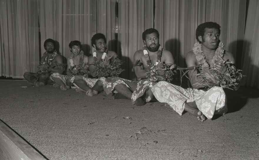 This image was taken for a story that ran in the Manawatu Evening Standard on 10 October 1970. The story ran: "Fiji became an independent nation today exactly 96 years after the islands were ceded to Queen Victoria by Fiji's King Charles, handed the islands back again in a ceremony watched by many descendants of the Fijian King. In Palmerston North, a Fijian Independence Day celebration was held on the evening of October 9. A welcoming ceremony in traditional style had been arranged by the Fiji students' association at Massey University. The 30 minute welcome included the presentation of a tambua (whale's tooth) to Palmerston North mayor, Desmond Black. Tambua is a symbol of authority, dignity and respect. Eight guest including Mr Black were served with the country's national drink, Kava."