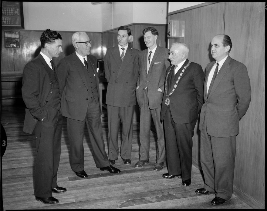 This image was taken for a story that ran in The Manawatu Evening Standard on 14 August 1961 "Men who figured prominently at the official opening of the New Zealand Universities' winter tournament and arts festival on Saturday afternoon are pictured here. From the left: Dr. A. Stewart, principal of Massey College, hosts for the tournament; Mr. W.B. Tennent, Minister of Education; Mr. C.M. Palmer, tournament controller; Mr. E.A. Woodfield, president of the New Zealand University Students' Association; the Mayor (Mr. G.M. Rennie); and Mr. J.R. Tye, acting principal of the Palmerston North University College."