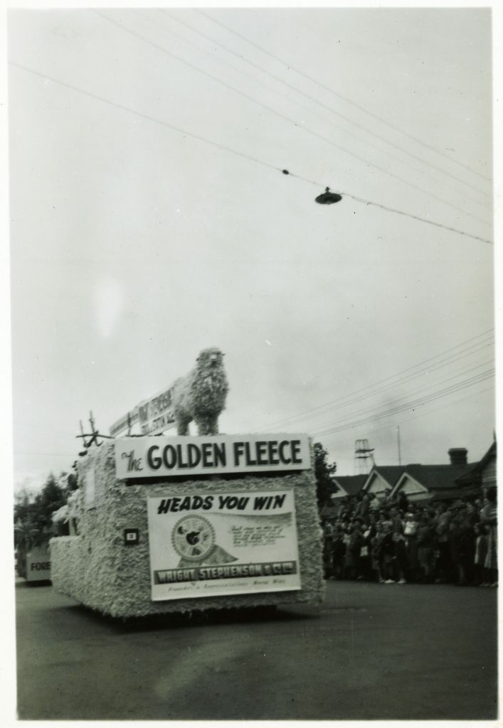 Palmerston North held its 75th Jubilee Celebrations during the week of 15th March 1952. Shown here is the Wright Stephenson and Co Ltd float, which has been covered in wool.