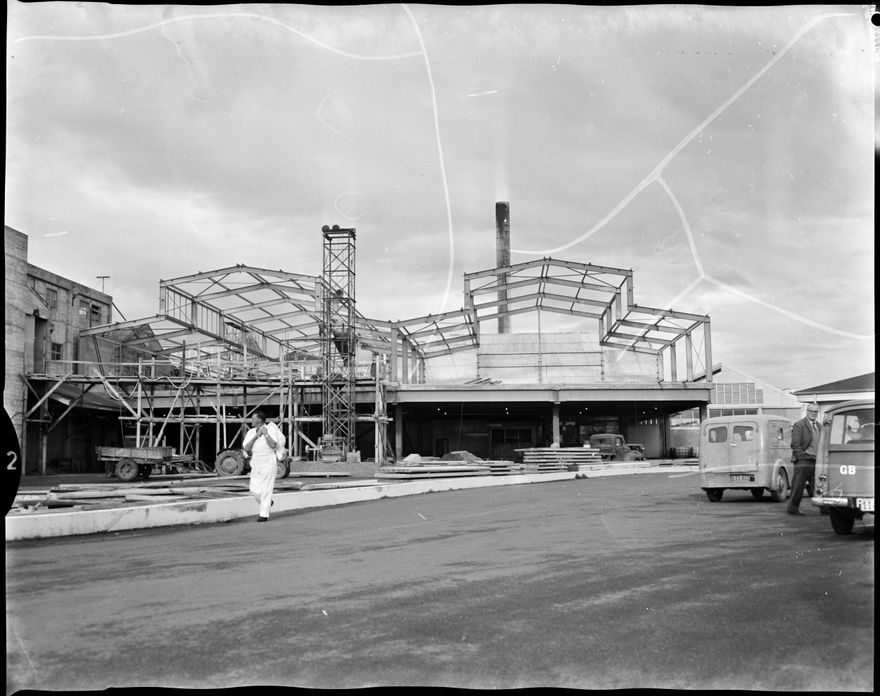 This image was not published in The Manawatu Evening Standard, taken on 6 July, 1963. "Under construction at Longburn Freezing Works is this 15,000 square foot wool store of steel and pre-fabricated concrete walls." Another image of the building works was published on 6 July, 1963.