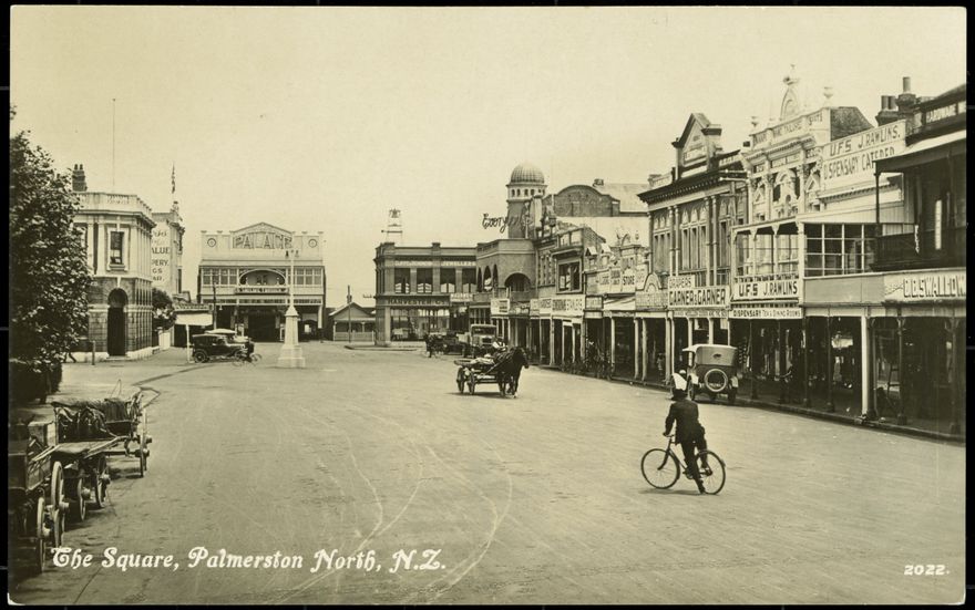 This postcard shows Coleman Place from 1923. There are several interesting things to note in this image. The Everybody's Picture Theatre (with the domed roof) was built in 1913 for Arthur Hopwood who leased the land. It was remodelled as the “Hotel Midland” in 1928, which operated under the license from the Occidental Hotel which burnt down in 1927. Much of the Hotel was demolished in 1965-1966. The Palace Theatre was built in 1915 on the site once occupied by the Manawatu Stables. The tower structure that can be seen poking above the Harvester Co. building (currently occupied by Youth Space [2017]) is a bell tower that was used to alert the city in case of fire.