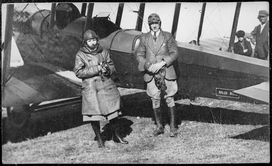 Captain Russell, DFC & Croix de Guerre, (right) was the pilot of the Walsh Brothers DH6 which travelled around New Zealand promoting air travel and taking people for 'joy rides'. 15 year old Violet Hibbard (left), of Dannevirke, was the passenger in the flight from Dannevirke to Palmerston North on 31 July, 1920. The Walsh Brothers aeroplane was the first plane to land in Palmerston North.