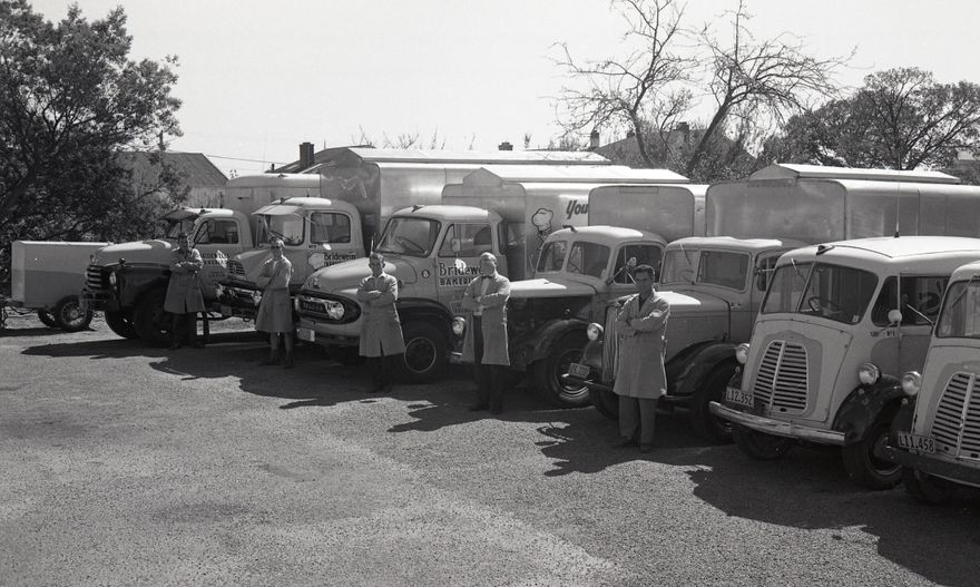 This image was taken by Frank Goldingham for Photorama pictorial magazine. Although it was housed with the April negatives, it was not published until the June edition in 1963. "Part of the Main Fleet of vehicles which deliver bread throughout Manawatu."