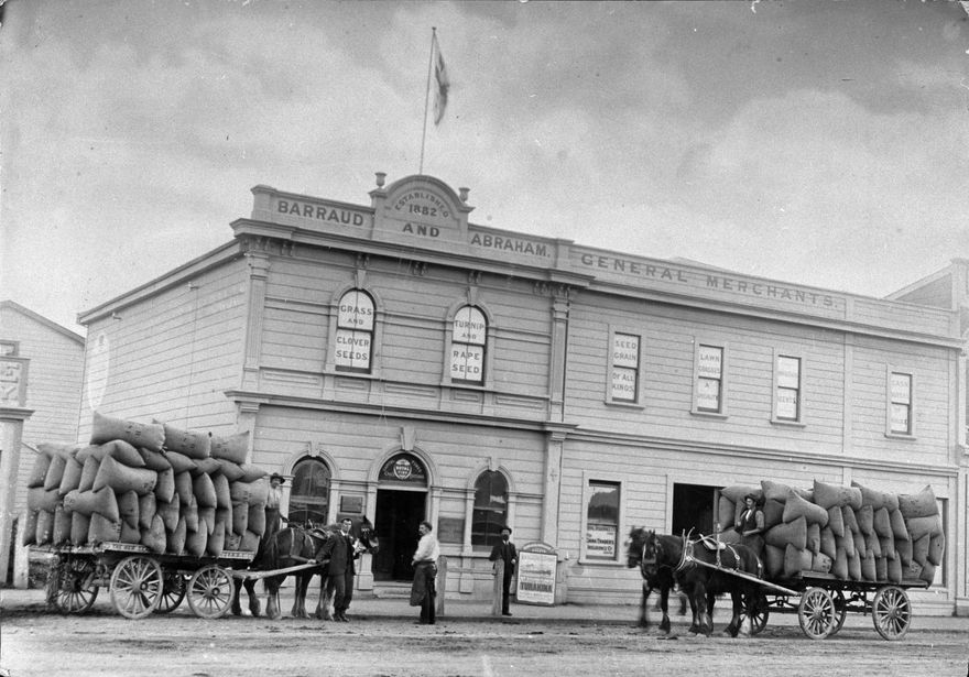 This photograph is from a set of 7 entitled "Grass-Seed Raising in the Manawatu". The accompanying caption reads: “Carting Seed into the Store. This picture tells us the seed has, so to speak, reached a ‘temporary home.’ We see the lorries full of dressed seed arriving at the warehouse of a well-known firm of seed merchants in Palmerston North, from whence it will be distributed all over the world”. Barraud & Abraham’s wooden premises stood in Rangitikei Street.