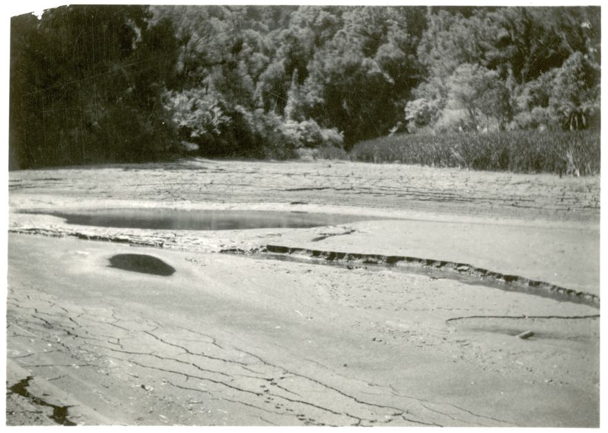 Palmerston North experienced a period of severe water shortage in the summer of 1943-1944, when the level of the lake a Turitea fell 3.5m below the bywash of the dam. This photograph is similiar to an image published in the Manawatu Times on 29 February 1944, accompanied by the caption: "CITY'S DIMINISHING WATER SUPPLY - This photograph is a panorama of the top portion of the reservoir at Tiritea showing tons of silt and mud accumulated over the last six or seven years and displacing much-needed water. Around the corner of the stream on the right of the picture is as much mud again, but of greater depth. This siltation has been exposed by the fall in the water level of the dam, which yesterday was over 10ft. below the spillway."