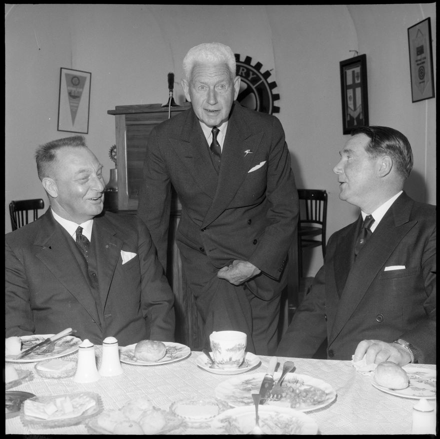 This image was taken for a story that ran in The Manawatu Evening Standard on 15 June 1961 "The Parliamentary Under-Secretary to the Minister of Finance (Mr. Seath) was the guest-speaker at a luncheon held today by the Palmerston North branch of the National Party. Current problems discussed by Mr. Seath were balance of payments, membership of the International Monetary Fund, and the European Common Market. Mr. Seath (right) is seen talking to Mr. W.H. Brown, M.P. (left) and Sir Matthew Oram, a former speaker of the House of Representatives."