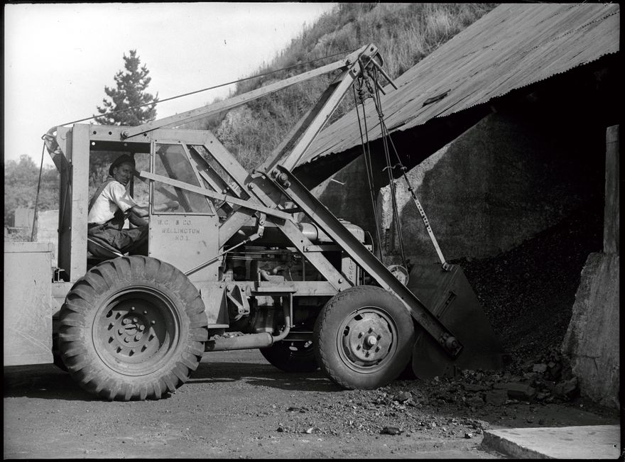 A Niven Engineering built shovel fixed to this tractor built by W.G. Co. Wellington is used to shift coal at the Palmerston North Gas Works.