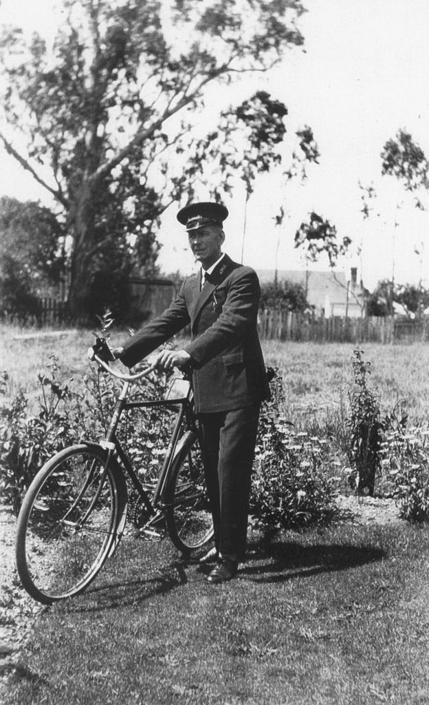 William Floyd (1876-1931) was born in England and was a member of the Police Force of Scotland Yard before emigrating to New Zealand with his family c 1924. He was the inspector for the Palmerston North branch of the Society for the Prevention of Cruelty to Animals 1926-1931, and is pictured in his uniform, with his bike.